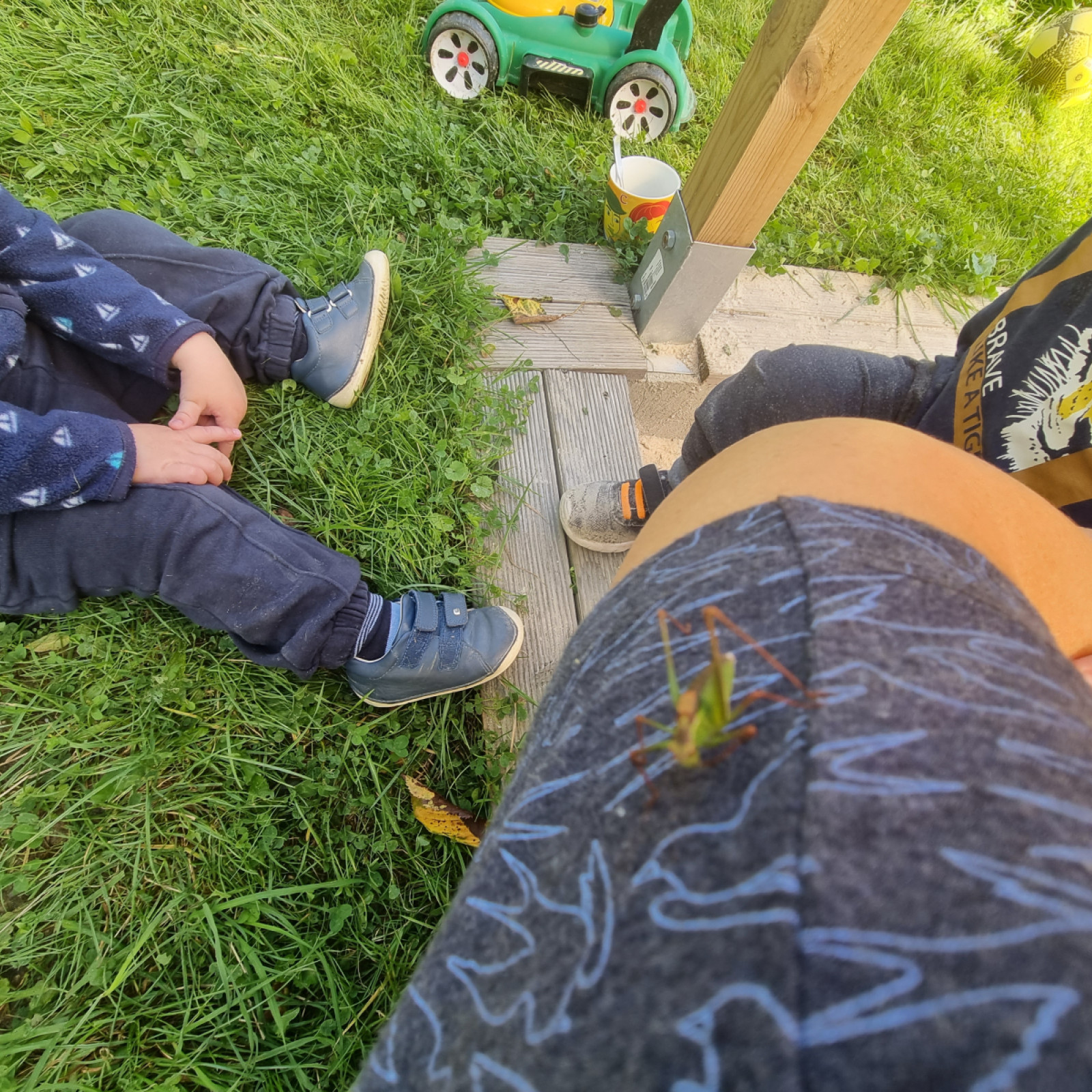 Da unser Lebensmittelpunkt auf der wilden Wiese liegt, treffen wir beinahe täglich auf Lebewesen der Natur, die zum Beobachten und Staunen einladen. Bei diesen Besuchen achten wir immer auf ihren und unseren Schutz, agieren respektvoll und vorsichtig. Oft nutzen wir diese Zufallsbegegnungen und vertiefen sie später durch Buchbetrachtungen und Bastelarbeiten. Dies sorgt für viele Gesprächsanreize und lädt ganz spielerisch zum Lernen ein.